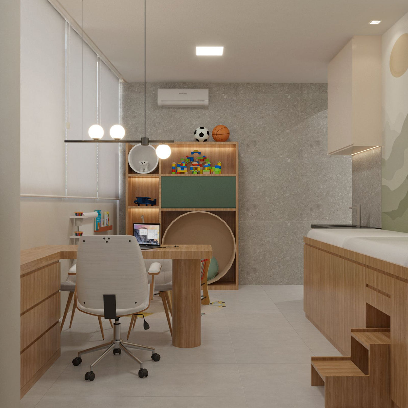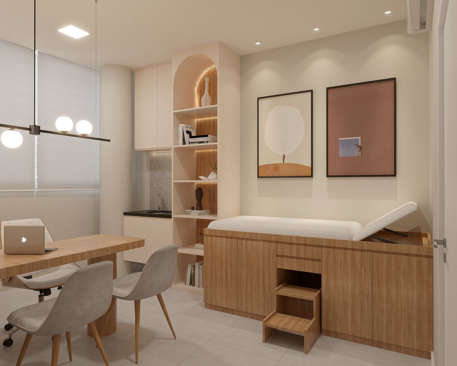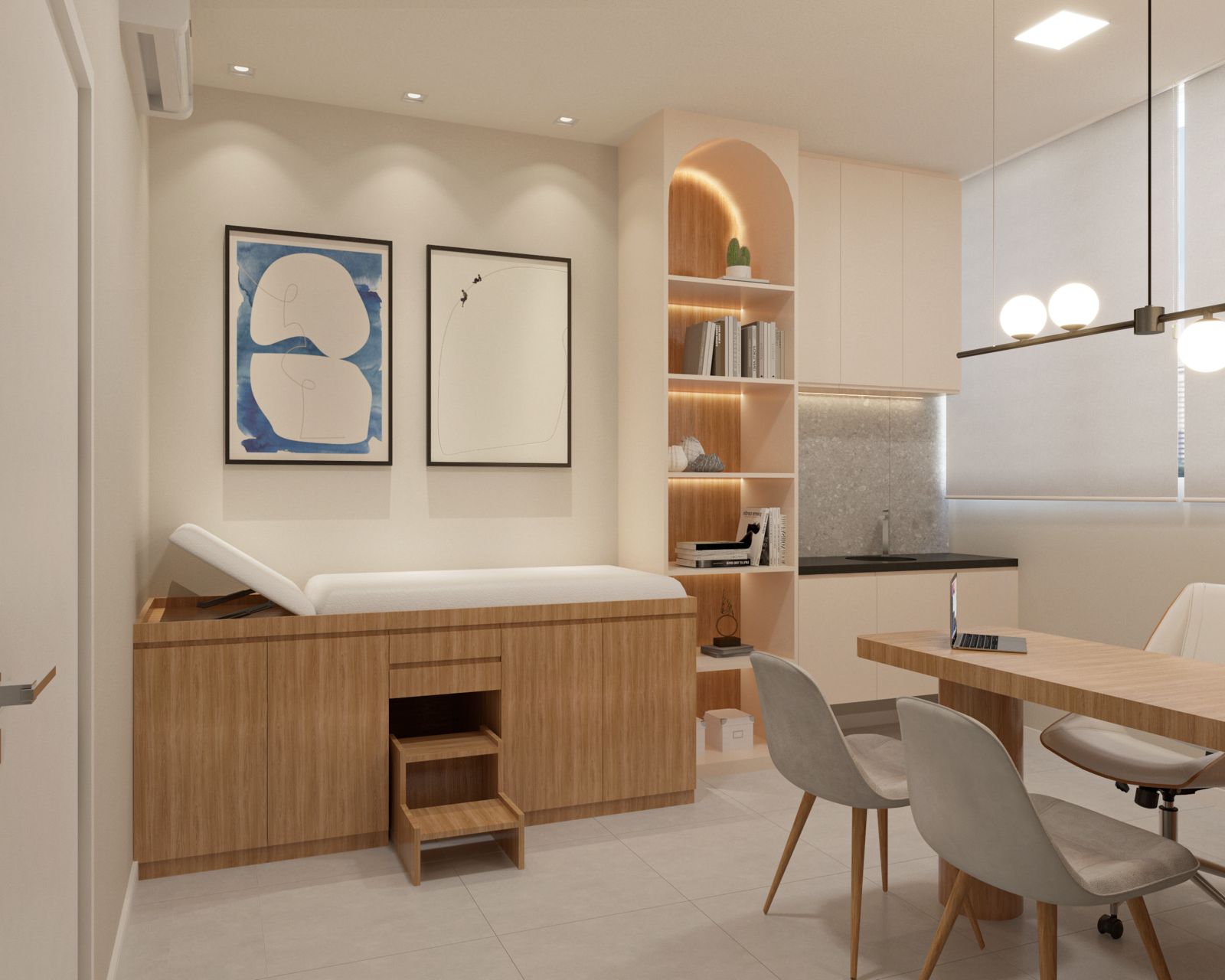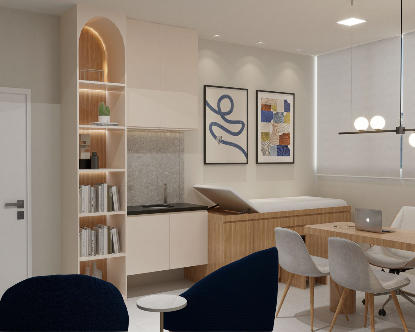 O projeto MedRios realizado pelo escritório é uma clínica de coworking em Três Rios, Rio de Janeiro. O desafio aqui era duplo: criar um ambiente neutro para acomodar diversas especialidades médicas e, ao mesmo tempo, garantir a serenidade necessária para crianças autistas atendidas pela pediatra proprietária.