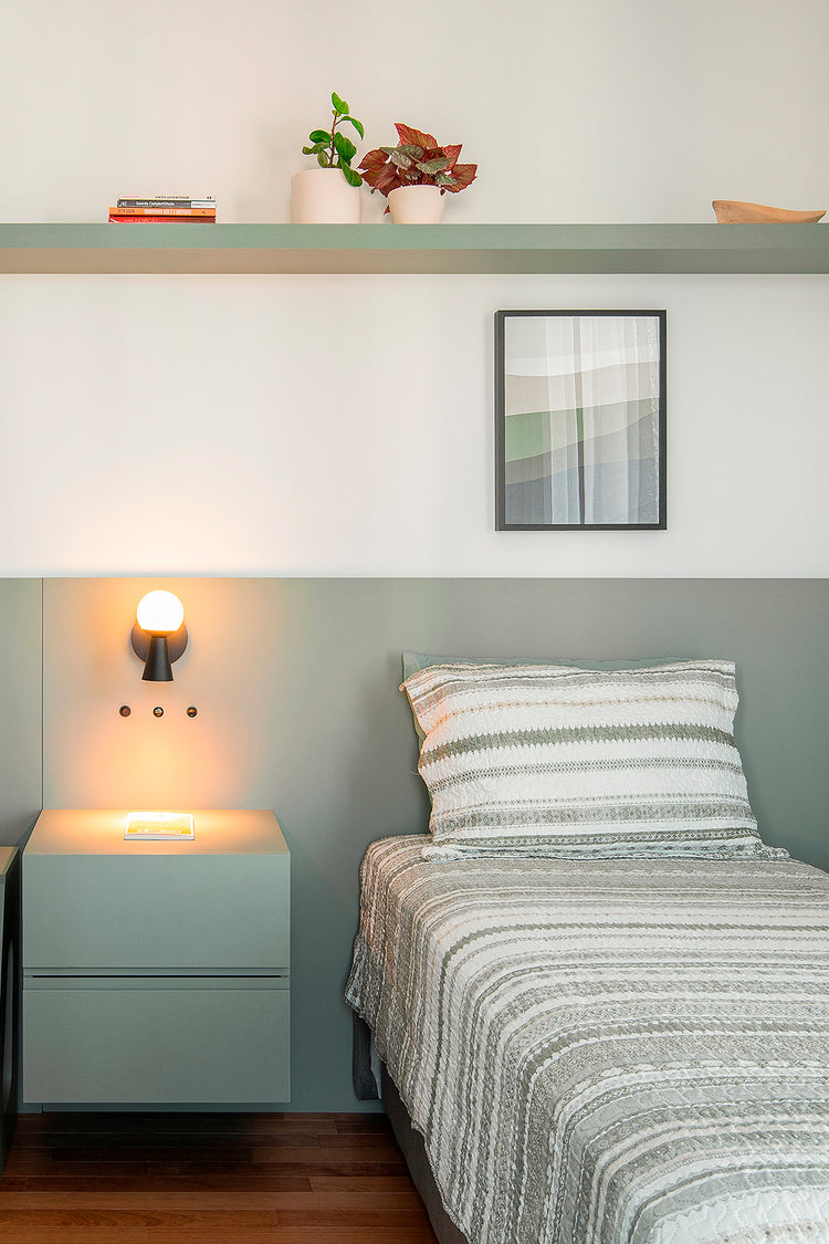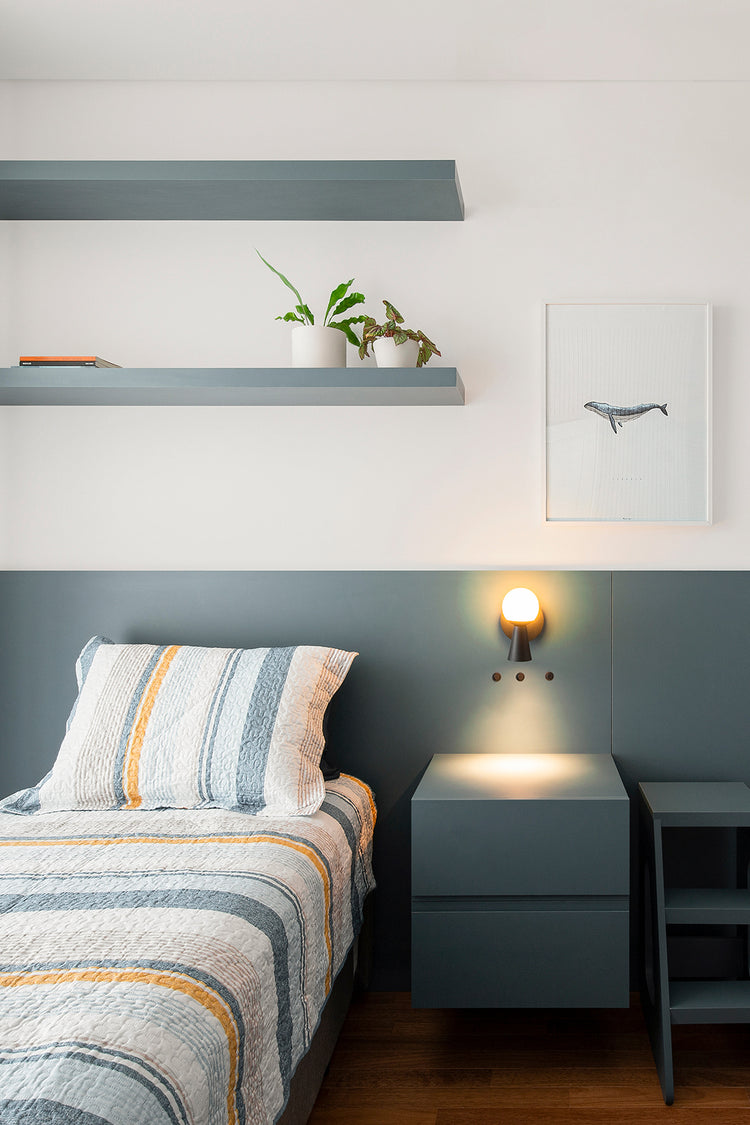 Já no pavimento superior, encontram-se os dormitórios, com cores e ilustrações amigáveis para o ambiente das crianças e tons sóbrios com texturas de materiais para o quarto do casal.